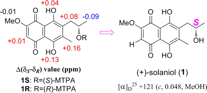 The absolute stereochemistry of ( +)-solaniol (5,8-dihydroxy-7-(2-hydroxypropyl)-2-methoxy-6-methyl-1,4-naphthoquinone) (1) was deduced to be S using Mosher’s method. Our result did not accord with the R configuration of ( +)-solaniol recently proposed by Maharjan et al., but agreed with the S configuration determined by X-ray crystallographic analysis by Kyekyeku et al. In addition, complete and unambiguous assignments of 13C NMR signals for 1 are reported.