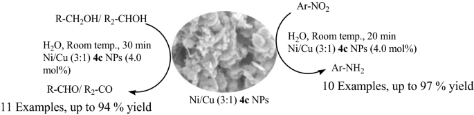 The highly active Ni/Cu bimetallic nanoparticles (NPs) of the different molar ratios of Ni and Cu (1:1, 1:3, 3:1) assisted by dendritic ligand 2,4,6-Tris (di-4-chlorobenzamido)-1,3-diazine were synthesized successfully confirmed by Scanning Electron Microscopy (SEM), Electron Diffraction X-ray (EDX), X-ray fluorescence spectroscopy (XRF), X-ray diffraction (XRD), and Transmission Electron Microscopy (TEM) analysis. These NPs were studied as a heterogeneous catalyst for the chemoselective oxidation of alcohol to the corresponding aldehyde at 30 min and chemoselective reduction of aromatic nitro substituents to the corresponding amino substituents at 20 min, while the Ni/Cu (3:1) NPs were found to be the most effective among other Ni/Cu (1:1) and Ni/Cu (1:3) NPs at room temperature under mild conditions. The Ni/Cu (3:1) NPs can be recycled for at least five successive runs with no perceptible decrease in catalytic activity.