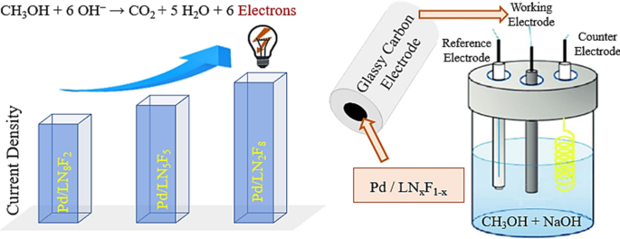 Improving the yield of catalysts containing palladium for the polymeric fuel cells is the main challenge in the commercializing of this technology. The utilization of transition metal oxides as the promoters can be an efficient solution for more poisoning removal of the catalyst. The stoichiometry effect of the oxide support on the activity of Pd for electrooxidation of the CH3OH is presented in this study. The lanthanum nickelate substitutes with different ratios of Fe:Ni (1:4, 1:1, and 4:1) are synthesized and characterized using SEM, EDX, XRD, FT-IR, and VSM analyses. The proposed oxide samples are in the Ruddlesden–Popper salts group with general chemical formula (LaNixFe1−xO3)nLaO and the crystal structure of the lanthanum nickelate is changed from orthorhombic to rhombohedral with the increasing ratio of nickel to iron. Also, the nano-sized Pd catalyst is anchored on as-prepared oxides via wetness incorporation. The behavior and efficiency of as-prepared electrocatalysts are compared with each other using the electrochemical techniques. Based on the results, the current density presented an ascending trend from 92.07 to 130.83 mA/cm2 for 0.8 M CH3OH by increasing the Fe ratio. It means that the nanocomposites containing more iron improved the catalytic ability of palladium and the reaction kinetics of the CH3OH oxidation. The functions of current and transferred charge vs. time are, respectively, obtained to simulate and integrate chronoamperometric data for oxidation of CH3OH. It seems the lattice oxygens, and the activation of an oxidation–reduction cycle between the high and low chemical valences of iron, leading to progress the catalytic performance of palladium.