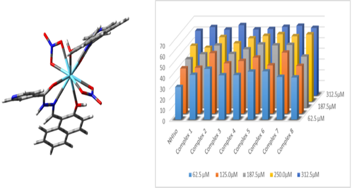 Rare metals have been used in pharmaceuticals and for medicinal purposes for long time. Currently, the link between some specific medicinal and biological properties of inorganic drugs has been established. [Ln(NO3)3] complexes with N-(2-hydroxynaphthalen-1-yl) methylene) isonicotinohydrazide Schiff base, [Ln(NHIso)2(NO3)2]NO3, complexes 1–8, were prepared and characterized using different techniques. The expected coordination for prepared complexes is ten, six from the tri-dentate NHIso ligand, and four from the two bi-dentate nitrate groups. DFT calculations on La and its cationic [La(NHIso)2(NO3)2]+ complex were carried out at the B3LYP level of theory. The NHIso ligand and its lanthanide complexes were screened for antimicrobial activity, in vitro activity against four gram-negative bacteria Ec: Escherichia coli; Kp: Klebsiella pneumonia; Pm: Proteus mirabilis; Pa: Pseudomonas aeruginosa, with two gram-positive bacteria En: Enterococcus faecalis and Sa: Staphylococcus aureus. Complexes 1, 2, 4, 7 and 8 showed excellent and higher activity against En and Sa Gram-positive bacteria than the free ligand, especially complex 2 with a MIC value of 4 μg/mL. The reported complexes have greater and significant efficiency in quenching DPPH than that of free NHIso ligand, with a scavenging activity between 39 and 65%.