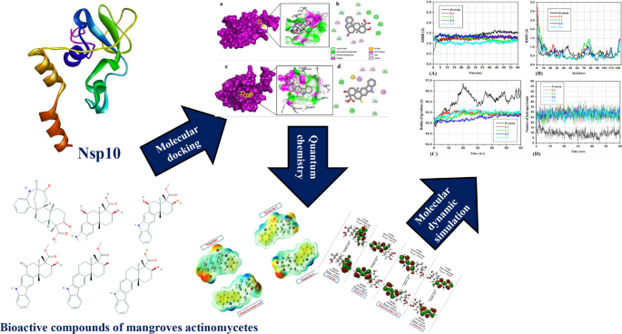 The current study reveals the inhibitory potential of novel bioactive compounds of mangrove actinomycetes against nsp10 of SARS-CoV-2. A total of fifty (50) novel bioactive (antibacterial, antitumor, antiviral, antioxidant, and anti-inflammatory) compounds of mangrove actinomycetes from different chemical classes such as alkaloids, dilactones, sesquiterpenes, macrolides, and benzene derivatives are used for interaction analysis against nsp10 of SARS-CoV-2. The six antiviral agents sespenine, xiamycin c, xiamycin d, xiamycin e, xiamycin methyl ester, and xiamycin A (obeyed RO5 rule) are selected based on higher binding energy, low inhibition constant values, and better-docked positions. The effective hydrogen and hydrophobic (alkyl, \(\pi\)–sigma, \(\pi\)–\(\pi\) T shaped and \(\pi\)-alkyl) interaction analysis reveals the four antivirals sespenine, xiamycin C, xiamycin methyl ester, and xiamycin A are supposed to be the most auspicious inhibitors against nsp10 of SARS-CoV-2. Quantum chemistry methods such as frontier molecular orbitals and molecular electrostatic potential are used to explain the thermal stability and chemical reactivity of ligands. The toxicity profile shows that selected ligands are safe by absorption, distribution, metabolism, excretion, and toxicity profiling and also effective for inhibition of nsp10 protein of SARS-CoV-2. The molecular dynamic simulation investigation of apo and halo forms of nsp10 done by RMSD of C\(\alpha\) atoms of nsp10, all amino acid residues RMSF, count total number of hydrogen bonds and radius of gyration (Rg). MD simulations reveal the complexes are stable and increase the structural compactness of nsp10 in the binding pocket. The lead antiviral compounds sespenine, xiamycin C, xiamycin methyl ester, and xiamycin A are recommended as the most promising inhibitors against nsp10 of SARS-CoV-2 pathogenicity.
