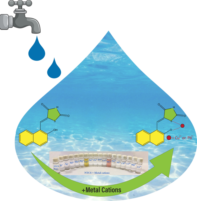 Abstract: In this work, a colorimetric chemosensor containing thiazolidinedione as a biologically active molecule (NTCS) was successfully used for the highly selective and ultra-sensitive detection of Pb2+ and Cu2+ ions in different water samples as well as in a living cell both visually and optically. The characterization of the probe was confirmed by NMR, FT-IR spectroscopy, and UV–Visible absorption techniques prior to experiments. Probe NTCS exhibits an obvious color change because of a ligand to metal charge transfer (LMCT) complex that transforms it from colorless to yellow in the presence of Cu2+ and from colorless to peach in complexation with Pb2+ in aqueous methanol–water solutions that could make it a suitable ‘naked-eye’ indicator for Cu2+ and Pb2+. Based on Job’s plot analysis, the interaction binding mode of probe NTCS with Cu2+ (NTCS-Cu2+) and Pb2+ (NTCS-Ni2+) was found to be 1:1 stoichiometry complex. The stability of probe-ligand in different pH ranges (9–11) was concerned with determination of the optimum pH for the detection of Cu2+, and Pb2+ ions, which provides NTCS chemosensor suitable for quantitative analysis of the above-mentioned ions under physiological state. The results illustrated that the low detection limits (LOD) for Cu2+ and Pb2+ were calculated as 27.7 nM and 0.79 nM, respectively. In order to quick and convenient “naked-eye” detection of the Cu2+ and Pb2+ ions in pure aqueous media, low-cost NTCS-based test paper strips were successfully handed-down. MTT assay and bioimaging results indicated the probe has low toxicity, biocompatibility, and successful cellular absorption; hence, the probe can be used in Cu2+ and Pb2+ recognition in living cells with high selectivity and sensitivity compared to other chemosensors being researched in recent years. Graphical abstract