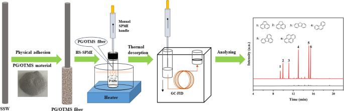 In this work, we propose a new method for resource utilization of PG by using octadecyltrimethoxysilane (OTMS) to modify the surface of PG to enhance its hydrophobic property. The modified PG was further coated on the surface of stainless steel wire to obtain PG/OTMS fiber for headspace solid-phase microextraction (HS-SPME) of polycyclic aromatic hydrocarbons (PAHs). Some properties of the prepared PG/OTMS fiber like morphology, structure and stability were tested. The extraction mechanism by the PG/OTMS fiber for PAHs was discussed, which mainly owed to non-covalent cation-π interaction and hydrophobic interactions. Under the optimal extraction condition, an HS-SPME combined with gas chromatography-flame ionization detection (GC-FID) based on PG/OTMS fiber was established for the analysis and detection of trace PAHs in lake water, which exhibits a good linear range (0.1–100 ng mL−1), low LODs (0.03–0.31 ng mL−1), and good reproducibility (3.28–9.09%). The HS-SPME/GC-FID analytical approach based on PG/OTMS fibers opens up new avenues for the application of PG in chromatographic analysis and sample pretreatment. In addition, the application of PG/OTMS provides a reference to solve the environmental pollution caused by the long-term accumulation of PG, thus realizing the resource utilization of waste PG.