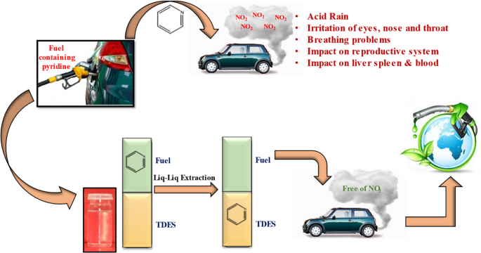 Abstract: Pyridine, which is nitrogen containing compounds is commonly found in crude oil and can lead to the production of NOx upon combustion. Liquid–liquid extraction is employed for removing nitrogen containing compounds from oils. In the current study, ternary deep eutectic solvents (TDES) were synthesized and used for the extraction of pyridine from a model fuel. The effect of different experimental parameters such as temperature (20 to 60 °C), time (1 to 60 min), initial pyridine concentration (0.1 to 10wt%), and TDES-to-model fuel ratio (1:5 to 5:5) was studied on extraction performance of TDESs for pyridine. Extraction efficiencies greater than 95% were observed for all single batch liquid–liquid extraction experiments. The value of thermodynamic parameters such as ΔG (KJ/moL), ΔS (J/moL/K) and ΔH (KJ/moL) were determined from the data collected at different temperatures. The efficient removal of pyridine from model fuel was found to be due to protonation of the nitrogen. Furthermore, the removal efficiency of regenerated TDES after 5 cycles was approximately equal to first extraction cycle. Finally the synthesized TDES system was employed for removing pyridine from crude oil. By optimizing process parameters, TDES exhibited remarkable performance in removing these compounds from both model oil and crude oil. The results concluded that TDES can be an efficient, cost effective and environmentally benign solvent for the extractive pyridine and other nitrogen containing compounds from model fuel. Graphical Abstract
