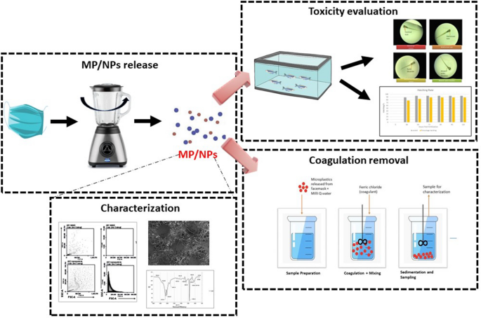 Abstract: The widespread adoption of face masks as personal protective equipment during the COVID-19 pandemic has introduced a novel source of microplastics (MPs) and nanoplastics (NPs) to the environment. These face masks are primarily fabricated from non-renewable polymers, particularly polypropylene and polyethylene, that can be potential sources of MPs/NPs. The release of MPs/NPs from face masks has become a great concern due to a lack of proper disposal. The present work deals with the study of the release and characterization of MPs/NPs generated from face mask fabric. Scanning electron microscopy and flow cytometry showed that exposing face mask fabrics to different levels of mechanical stress can break them down into smaller debris, including MPs/NPs. Furthermore, the effects of MPs/NPs on the early life stages of zebrafish (Danio rerio) were studied by investigating morphological abnormalities from 0 to 96 h post-fertilization. Lastly, a mitigation strategy based on coagulation removal using iron chloride (FeCl3) was developed and optimized for the removal of MPs/NPs from water. Graphical abstract
