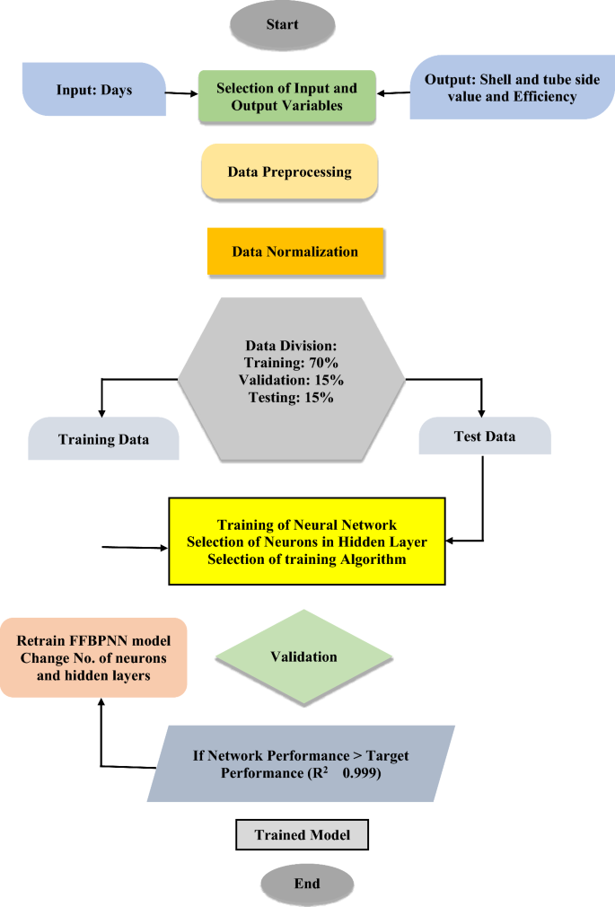 Abstract: The petroleum refining business consumes approximately 0.2 MMBTU/BBL of energy annually. This consumption is mitigated using heat integration techniques. However, a significant challenge in this process is fouling in the preheat train network of heat exchangers. Fouling necessitates regular cleaning, leading to substantial operational inefficiencies and costs, with annual losses estimated at nearly $16.5 billion. To address this issue, implementing a predictive maintenance model is crucial for performing maintenance at optimal periods, thereby reducing these losses. The study proposes an artificial neural network (ANN) developed using MATLAB’s nntool, trained on industrial heat exchanger samples that were preprocessed in Microsoft Excel. This ANN model is designed to forecast fouling patterns in shell and tube heat exchangers. The model’s accuracy and effectiveness were validated using R2 (coefficient of determination) and RMSE (root mean square error) measures. The results indicated that the EA-307 Feed-Forward Back-Propagation Neural Network (FFBPNN) model delivered satisfactory performance, with an R2 value of 0.9961. This high level of accuracy underscores the significant impact of the number of neurons on the model’s predictive output. Furthermore, the model’s testing on a new dataset yielded impressive results, achieving an R2 value of 0.966. This demonstrates the model’s robustness and reliability in predicting fouling patterns, facilitating improved maintenance schedules, and minimizing the financial losses associated with fouling. The study highlights the potential of advanced neural network models to significantly enhance the operational efficiency of petroleum refineries by enabling more precise and timely maintenance interventions. Graphical abstract