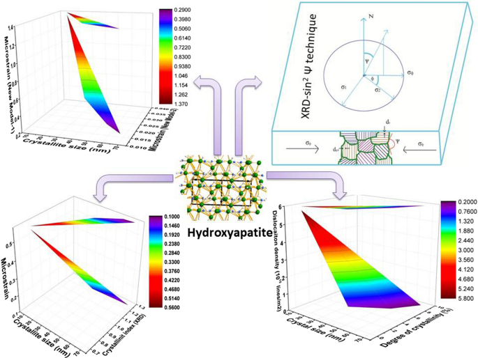 This paper reports a detail crystallographic investigation of a well-known biphasic biomaterial containing hydroxyapatite (HAp) and β-tricalcium phosphate (β-TCP). This biphasic calcium phosphate bioceramic (BCP) was synthesized by three typical methods: (i) solid-state method (where CaCO3 and (NH4)2HPO4 was the source of Ca and P, respectively); (ii) wet chemical method (where the reactants were Ca(OH)2 and H3PO4); and (iii) direct incineration of bovine bones. Furthermore, the adopted fourth method to synthesize the biphasic biomaterial was UV irradiation instead of high temperature calcination. In each case the synthetic biphasic biomaterial was characterized by employing X-ray diffraction (XRD) and Fourier transform infrared (FT-IR) techniques. Various crystallographic parameters such as crystallite size, dislocation density, microstrain, crystallinity index (from XRD and FT-IR), HAp percentage, β-TCP percentage, the volume fraction of β-TCP, and degree of crystallinity were estimated by conventional approaches for the broader applicability of this biphasic biomaterial. Two new models for measuring microstrain and one new method (XRD-sin2Ѱ technique) for calculating residual stress (also known as intrinsic stress) were developed to estimate the crystallographic parameter more accurately. A linear relationship was illustrated among the value of conventional methods and newly developed techniques without significant difference (R2 = more than 0.9) among the values of four types of HAp.