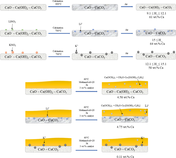 CaO-supported Li and K catalysts were studied for transesterification reactions. The CaO was obtained from calcined commercial limestone. The catalysts were impregnated with LiNO3 and KNO3, reaching a loading of 3 wt.% of alkali metal. The synthesized catalysts were characterized by thermogravimetric analysis, X-ray diffraction, and Hammett indicators. The catalytic transesterification evaluations of tributyrin, triestearin, and triolein with methanol were carried out with methanol/triglyceride molar ratio of 20:1 and 3 wt.% of catalyst at 60 °C for one hour. It was found that the strength of the alkaline sites increased when alkali metal was added to the support since these metals prevented the formation of Ca(OH)2. The Li/CaO catalyst presented higher basic strength and higher catalytic activity. It was observed that short-chain triglycerides were found to be more reactive than long-chain and unsaturated ones; likewise, saturated chain triglycerides are more reactive than unsaturated ones due to fewer interactions with the active sites. Finally, potassium avoided the lixiviation of the catalysts to the liquid phase.
