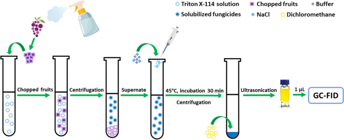A new method of cloud point preconcentration coupled with ultrasound-assisted back extraction of fludioxonil, fenarimol, metalaxyl for determination by gas chromatography with flame ionization detection (GC-FID) in fruits was developed. Some parameters with an effect on the extraction, such as the concentration of Triton X-114, pH influence, incubation time, equilibration temperature and centrifuging parameters were studied and optimized. When using solutions of Triton X-114 for extraction of 0.5% (w/v), the complete extraction of fungicides is observed in the pH range 5.2–8.0 under the conditions of the existence of their neutral molecular forms at an equilibrium phase separation temperature of 45 °C. Surfactant-rich phases were formed by centrifuging solutions at 4000 rpm for 15 min. The method was validated and characterized by the following metrological parameters: the limit of detection (LOD, 3σ) of fludioxonil is 0.06 μg⋅mL−1, the limit of quantitation (LOQ, 10σ) – 0.21 μg⋅mL−1, working range 0.21–10.0 μg⋅mL−1; for fenarimol LOD – 0.10 μg⋅mL−1, LOQ – 0.33 μg⋅mL−1, working range – 0.33–10.0 μg⋅mL−1; for metalaxyl LOD – 0.15 μg⋅mL−1, LOQ – 0.50 μg⋅mL−1, working range – 0.50–10.0 μg⋅mL−1. The procedure was used for determination of fludioxonil, fenarimol, metalaxyl in grapes after their treatment with commercial preparations of fungicides. The results show that the sensitivity, metrological characteristics, ecological safety, simplicity and convenience of the suggested procedure exceed its analogs based on extraction using organic solvents.