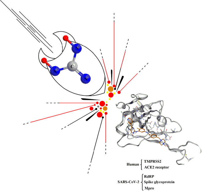 The current viral pandemic, coronavirus disease 2019 (COVID-19), caused by severe acute respiratory syndrome coronavirus 2 (SARS-CoV-2), creates health, mental, economic, and other serious challenges that are better to say global crisis. Despite the existence of successful vaccines, the possible mutations which can lead to the born of novel and possibly more dangerous variants of the virus as well as the absence of definitive treatment for this potentially fatal multiple-organ infection in critically ill patients make us keep searching. Theoretically targeting human and viral receptors and enzymes via molecular docking and dynamics simulations can be considered a wise, rational, and efficient way to develop therapeutic agents against COVID-19. In this way, The RNA-dependent RNA polymerase (RdRP), main protease, and spike glycoprotein of SARS-CoV-2 as well as the human angiotensin-converting enzyme 2 receptor and transmembrane serine protease 2 are the most discussed and studied targets that play essential roles in the viral life and infection cycle. In the current in silico investigation, the guanidine functionality containing drugs and medicinal substances such as metformin, famotidine, neuraminidase inhibitors, antimalarial medications, anticancer drug imatinib, CGP compounds, and human serine protease inhibitor camostat were studied against the above-mentioned therapeutic targets and most of them (especially imatinib) have revealed an incredible spectrum of free docking scores and MD results. The current in silico investigation that its novel perspective of view is corroborated by the different experimental and clinical evaluations, confirms that the guanidine moiety can be considered as a missing promising pharmacophore in drug design and development approaches against SARS-CoV-2. Considering the chemical potency of this polyamine group in chemical interaction creation, the observed outcomes in this virtual screening were not surprising. On the other hand, the guanidine functional group has unique physico-chemical properties such as basicity that can make the target cells intracellular pH undesirable for the virus entry, uncoating, and cytosolic lifecycle. According to the obtained results in the current study that are interestingly confirmed by the previously reported efficacy of some the guanidine carrying drugs in COVID-19, guanidine as a potential multi-target anti-SARS-CoV-2 functional scaffold deserves further comprehensive investigations.