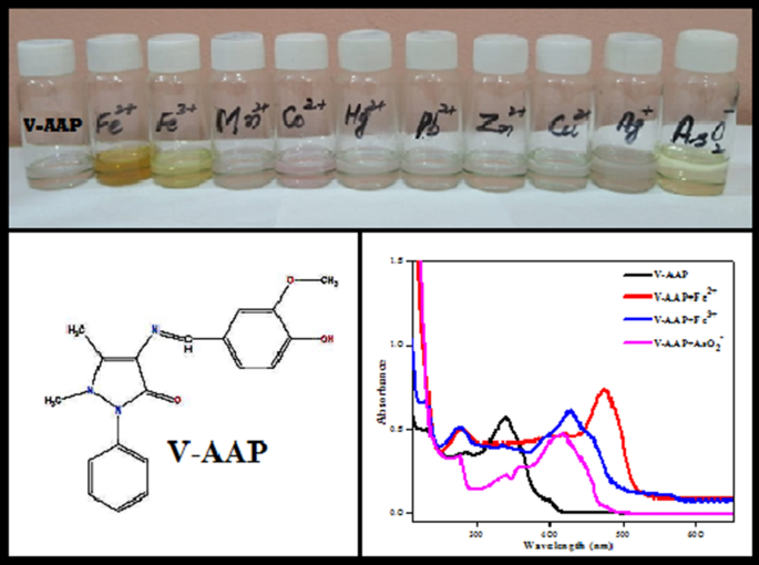 Optical sensors have drawn considerable attention these days due to their quick, easy and on-site detection of metal ions. In this research, a Schiff base “4-(Benzylideneamino)-1,5-dimethyl-2-phenyl-1,2-dihydropyrazol-3-one (V-AAP)” was studied for its naked eye chemosensing abilities to detect metallic ions, i.e., Fe2+, Fe3+, Mn2+, Co2+, Cu2+, Zn2+, Ag+, Hg2+, Pb2+ and AsO2−. This colorimetric probe exhibited selective color change from colorless to brownish yellow, pale yellow and greenish yellow for Fe2+, Fe3+ and AsO2− ions, with detection limits of 9.986 × 10–7 M (0.056 ppm), 1.285 × 10–6 M (0.072 ppm) and 2.465 × 10–5 M (2.64 ppm), respectively. Moreover, binding ratios of V-AAP and Fe2+, Fe3+ and AsO2− ions were calculated to be 1:1 with binding constants 1.22 × 102 M−1, 1.30 × 103 M−1 and 9.30 × 101 M−1, correspondingly.