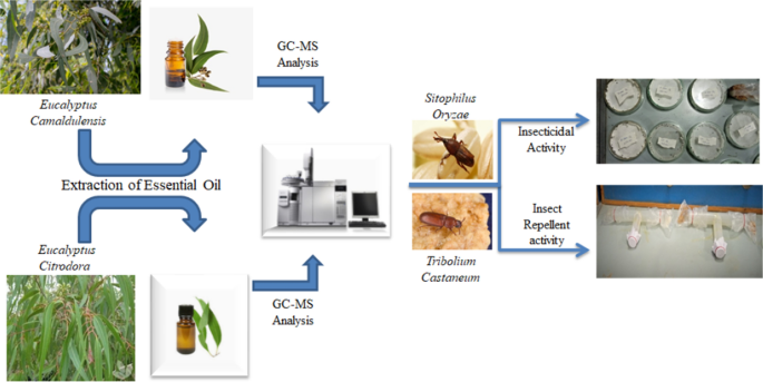 Keywords: Eucalyptus citriodora; Eucalyptus camaldulensis; Essential oils; Insecticidal activity; Repellent activity; Sitophilus oryzae; Tribolium castaneum