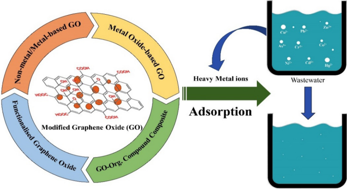 Abstract: Graphene and graphene oxide (GO) are used for adsorbing toxic heavy metal ions, but they have disadvantages like aggregation of graphene layers due to strong π–π interactions and difficulty in separation. Thus, adsorption efficiency of bare graphene and GO is quite low. Surface modification techniques have improved GO’s adsorption capacity. Various GO-based materials, including chemically modified functionalized GO, non-metal- and metal-based GO composites, metal oxide-based GO and GO-organic compound composites, have been designed for wastewater decontamination. In this review article, the chemistry of graphene-based composites reported by various group of workers since last ten years is reviewed. The synthesis processes, characterizations of prepared materials and application as scavengers or adsorbents were critically analysed. The limitations and the future directions are also highlighted. Graphical abstract