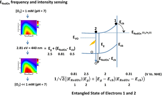 Abstract: Photoluminescence maximum emission signal of colloids based on Bi2WO6 suspended in an aqueous solution is blue-shifted as compared to its band gap according to Eg + (ERedOx-ECB). This process involves the exergonic non-radiative transfer of ECB electron to ERedOx and the concomitant radiative emission of a second electron that has gained ERedOx-ECB energy presumably by electrons energy levels entanglement induced via simultaneous light excitement of multiple electrons. These results constitute evidence for energy transfer with application in sensing electrolyte-electron-acceptors as reactive oxygen species that may be implemented for example in cancer and aortic dissection detection and treatment. Graphical abstractBi2WO6 electrons from water colloidal solution are entangled by light (Plasmon resonance) and excited from the Bi2WO6 valence band (VB) to its conduction band (CB). Electron 1 moves up the gradient at the surface and is transferred to the acceptor (ERedOx) at the electrolyte. The gained energy, ERedOx—ECb, is transferred to electron 2 via their entangled energy levels. Electron 2 then decays to the VB emitting light at the Bi2WO6 band gap (Eg) plus the energy gained. Sensing of the ERedOx and [RedOx] is then obtained.