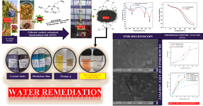 Abstract: Biomass has a wide range of uses due to its cost-effectiveness and enormous diversity of functional groups. This research investigates the production of an inexpensive and efficient adsorbent using the stem waste charcoal (FTCC) of Tinospora cordifolia and its use in water decontamination, with a focus on the elimination of metal ions and dyes. The study shows that chemically functionalizing the surface of charcoal with APTES (3-Aminopropyltriethoxysilane) improves adsorption capabilities. Various characterization techniques, such as FTIR, FESEM, TGA, and BET studies, were used to evaluate the efficiency of FTCC. The results showed a considerable improvement in surface qualities that are favourable for adsorption. BET evaluations indicate that functionalized carbon has a high surface area of 1.45766 m2.g−1 and a pore volume of 0.534772 cm3.g−1. Adsorption data fit well with Langmuir model and follow pseudo-second-order kinetics. Thermodynamic parameters reveal the endothermic adsorption of Congo red dye and exothermic adsorption of Cr (VI) metal ion. The batch adsorption experiments revealed that FTCC was capable of removing various dyes and metal ions from aqueous solution, with adsorption capacity 65.22 mg/g for Congo red and 56.61 mg/g for Cr (VI). The FTCC showed good reusability potential up to 6th cycle. Additionally, tests with water samples containing contaminants have been conducted to demonstrate the best adsorbent quality of FTCC. The study highlights the feasibility of using functionalized charcoal FTCC derived from agricultural debris as a renewable alternative for restoring the environment and water remediation. Graphical abstract