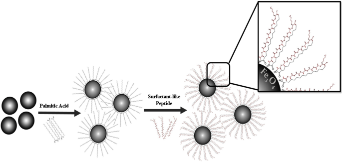 Abstract: The potential of Fe3O4 nanoparticles (NPs) can only be fully realized when highly stable water-dispersible particles with narrow particle size distribution and uniform morphology are produced in a simple sustainable and scalable process. Fatty acids have been successfully utilized as surfactants in the coprecipitation process to produce hydrophobic Fe3O4 NPs with desirable properties, which need additional processing to render them hydrophilic. In this study, an innovative single-step process was introduced for coating Fe3O4 NPs using two surfactant-like peptides, AC-A6K± and NH2-A6K± (±; refers to the coexisting positive and negative charge at the C-terminal of the peptides). This simplified process involves a single-step co-assembly of these peptides with aliphatic chains of palmitic acid (PA) at the surface of the Fe3O4 NPs. The impact of these modifications on the physicochemical properties of Fe3O4 NPs was thoroughly investigated, revealing that the peptide-coated particles exhibited enhanced dispersibility in aqueous environments, a more uniform morphology, nearly neutral zeta potential, and reduced aggregation, resulting in smaller and more uniform particles, when compared to lipid-stabilized NPs (Fe3O4 PA). Furthermore, the Fe3O4 PA NPs that were coated with AC-A6K± peptide (Fe3O4 PA/AC−A6K±) demonstrated superior coating efficiency and a more favorable particle size distribution than those coated with A6K± (Fe3O4 PA/A6K±). Notably, the crystal structure and magnetic saturation of the Fe3O4 PA NPs were preserved even after being assembled with AC-A6K± peptide. Our observations suggest that coating fatty acid-stabilized Fe3O4 NPs with surfactant-like peptides by a one-step co-assembly process is feasible and can produce magnetic nanoparticles (MNPs) with potential clinical application. Graphical abstract