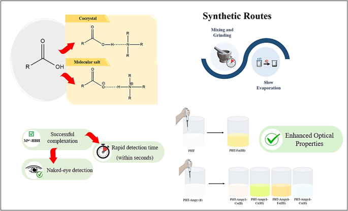 Non-covalent organic heterosynthons show enhanced properties in contrast to their individual coformers, rendering them promising for various applications. Specifically, hydrogen-bonded heterosynthons have shown effective coordination behavior with diverse metal ions, hinting at their potential for rapid optical sensing. Their straightforward synthesis and the interactions between the coformers make them good candidates for detection purposes. While organic acid derivatives are well known for their effectiveness as potential sensing agents toward different water pollutants, there remains a significant gap in the literature regarding the efficiency of heterosynthons linked via hydrogen bonding in colorimetric sensing applications, particularly for metal ions in aqueous environmental matrices. Therefore, in this study, five hydrogen-bonded heterosynthons, phthalic acid/2-amino-3-methylpyridine 1, phthalic acid/imidazole 2, dipicolinic acid/pyrazole 3, dipicolinic acid/imidazole 4, and dipicolinic acid/2-amino-3-methylpyridine 5 of two distinct dicarboxylic acids were synthesized using slow evaporation method and characterized using FT-IR, UV–Vis, 1H-NMR, and PXRD spectroscopic techniques. Physical mixtures with different molar ratios using the same coformers were prepared through a grinding method. Binary phase diagrams were constructed, and FT-IR analysis was performed to propose the type of heterosynthons being formed. The colorimetric detection efficiency of the synthesized heterosynthons toward a wide range of metal ions was examined and compared to that of their individual acids. Interestingly, all heterosynthons demonstrated enhanced colorimetric sensing performance toward metal ions. However, dipicolinic acid/pyrazole 3 and dipicolinic acid/2-amino-3-methylpyridine 5 did not show any significant color change in the presence of Ni(II) in contrast to the pure acid. This could be enhanced by improving the structural conjugation of the prepared heterosynthons and accordingly intensifying the obtained color and enhancing the naked-eye colorimetric detection results.