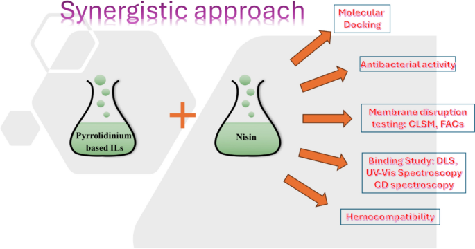 Abstract: Building on our earlier research, this study explores the improvement of the antibacterial activity of nisin (NIS) in the presence of long-range pyrrolidinium-based ionic liquids with Br− counter ions, similar to those previously reported with NTF2−. Our results demonstrate a notable enhancement in the antibacterial activity of NIS with ILs containing Br− ions against Escherichia coli (E. coli), highlighting a discovery of their synergistic effects as NIS alone is found to be ineffective against E. coli. Additionally, a similar experiment against Staphylococcus aureus (S. aureus) showed increased efficacy of NIS in the presence of ILs. Flow cytometry and confocal microscopy analyses revealed that NIS-IL conjugates disrupt the membranes of both E. coli and S. aureus. We also performed an in-depth analysis of the complex formation between ILs and NIS using molecular docking, surface tension measurements, UV–vis spectroscopy, and dynamic light scattering, confirming strong interactions between the components. Furthermore, CD spectroscopy confirmed the stability of the complex, and hemocompatibility assays verified its compatibility with human serum albumin. Graphical abstract