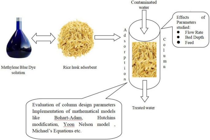 Textile industries nowadays are at the helm of pollution-causing units due to the utilization of organic dyestuffs such as methylene blue (MB) and others. This has led to severe criticism of the textile industry, and local governments have adopted strict pollution abatement campaigns in these industries to curb water pollution due to the usage of organic dyes. To facilitate the adsorption of MB and control the dye levels in the effluent, this study utilized rice husk (RH) as a potential adsorbent. The influence of different operating parameters, viz. initial concentration (10–30 mg/L), depth of adsorbent bed (25–45 cm) and flow rate (10–20 mL/min.), was studied using column adsorption. The analysis of the results showed that the maximum adsorption capacity of MB was found to be 3.15 mg/g at 20 mg/L feed, 35 cm bed depth and 10 mL/min flow rate. Comprehensive mathematical models, viz. Bohart–Adams, Hutchins and Yoon–Nelson, Wolborska and Michael’s equations, were used to evaluate different column bed design parameters. Along with the surface diffusion model, the Clark model and other models for calculating mass transfer effects were also investigated. Thomas and Wolborska models were investigated to determine the adsorption capacity of RH amounting to 2.0 mg/g and 5.625 mg/g, respectively, at an optimum flow rate of 10 mL/min. The results exhibited that rice husk exhibited a vast potential for the treatment of MB dye and the applied models validated the experiment data with good fit.
