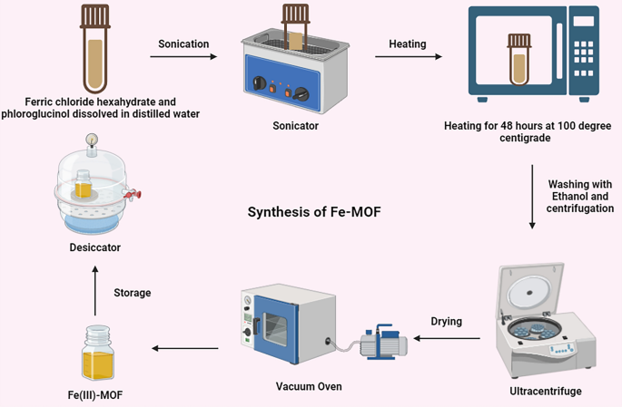 Abstract: This research reports solvothermal synthesis of iron(III) metal–organic framework (Fe-MOF) using ferric chloride hexahydrate and phloroglucinol ligand. The synthesized Fe-MOF was characterized using FTIR, powder X-ray diffraction, field emission electron microscopy, energy-dispersive X-ray spectroscopy, X-ray photoelectron spectroscopy and thermogravimetric analysis. The catalytic potential of synthesized Fe-MOF was evaluated through degradation of a major industrial pollutant phenol. Fe-MOF displayed optimal catalytic activity at lower concentration of hydrogen peroxide (5 mmol), lower Fe-MOF concentration, at 45-degree temperature and in 4 pH conditions. Phenol degradation efficiency was found to be comparatively higher than other conditions of Fe-MOF, H2O2 concentrations and temperature/pH conditions and good recyclability up to four cycles. The minimal use of hydrogen peroxide in the phenol degradation studies highlights efficiency and effectiveness of Fe-MOF as catalyst. The results demonstrate highly active, cost-effective, Fe-MOF catalyst for phenol degradation which can be utilized at industrial level. Graphical abstract