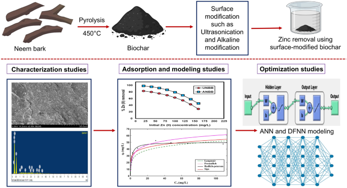 Abstract: Toxic heavy metal poisoning of water bodies, especially Zn (II) ions, is a serious risk to human health and the environment. Traditional treatment techniques may have low efficiency and significant operating expenses. In this study, alkaline-modified neem bark biochar (ANBB) and ultrasonicated neem bark biochar (UNBB) were evaluated as cost-effective and sustainable adsorbents for Zn (II) removal. To optimize adsorption conditions and enhance predictive accuracy, advanced artificial intelligence (AI) models such as artificial neural networks (ANN) and deep fuzzy neural networks (DFNN) were employed. The optimal conditions for zinc removal, as determined from batch experiments, were found to be at pH 4. The highest removal efficiency was achieved with a biosorbent dosage of 2.5 g/L for UNBB and 2 g/L for ANBB, a contact time of 40 min, and a temperature of 303 K. The kinetic tests verified pseudo-first-order kinetics as the best fit, while the isotherm analysis showed better fitting to the Freundlich model, suggesting adsorption on heterogeneous surfaces with maximal adsorption capacities of 153.07 mg/g for UNBB and 271.9 mg/g for ANBB. AI-based predictive modelling revealed the superiority of DFNN over ANN in adsorption performance prediction, with DFNN achieving an R2 value of 0.9982, significantly outperforming ANN (R2 = 0.5774). The integration of deep learning with fuzzy logic in DFNN provided enhanced interpretability and adaptability, enabling precise optimization of Zn (II) removal while capturing system uncertainties. These results demonstrate that AI-driven DFNN modelling is a reliable prediction tool for improving wastewater treatment decision-making, reducing experimental expenses, and optimizing adsorption processes. AI combined with biochar-based adsorbents offers an economically feasible approach for efficient and sustainable heavy metal removal. Graphic abstract
