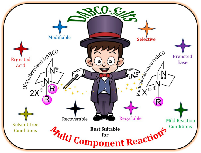 Abstract: The review article discusses the advancements in synthesis and applications of acidic, basic, and neutral 1,4-diazabicyclo[2.2.2]octane (DABCO) ionic salts in multi-component reactions. Compared to imidazolium-based ionic salts, the number of DABCO-based ionic salts is significantly lower. Recently, there has been increasing focus on these salts due to their selective salt formation capabilities. A significant challenge lies in the limited availability of physical data regarding DABCO-based ionic salts; hence, most of them are not ionic liquids. While many of these salts could be reused several times with only a minimal reduction in their catalytic effectiveness, there is a significant limitation in the availability of DABCO-based salts. Graphical abstract