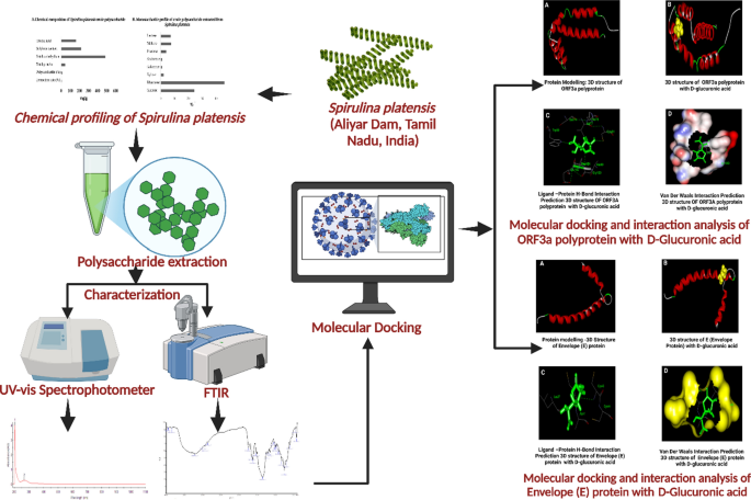 Graphical abstract for molecular docking and biological evaluation of S. platensis-derived glucuronic acid against SARS-CoV-2 ORF3a and E proteins
