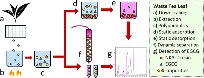Abstract: Green tea (Camellia sinensis) is intensely consumed all over the world and tea leaves discarded from production are a rich source of catechins, especially epigallocatechin-3-gallate (EGCG). This study aimed to perform preparative separation of EGCG from green tea waste by using macroporous resin and to reveal adsorption and desorption characteristics. Nine types of resins were compared for their adsorption and desorption capacities and desorption rate of EGCG, and NKA-2 was found the most suitable resin for the purpose. Adsorption isotherms were evaluated at 25 °C, 35 °C and 45 °C. Experimental data were well described with pseudo-second-order kinetics model and fitted best to the Langmuir model in tested temperatures. In dynamic separation process, 83% of adsorbed EGCG was recovered from the resin by using 70% ethanol. It has been thought that using macroporous resin can be an effective way of EGCG separation from green tea waste for commercial purposes. Graphical abstract
