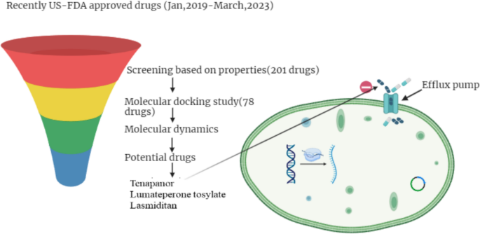 Identification of recently FDA-approved drugs as a repurposing candidate against multidrug efflux pump subunit AcrB of Escherichia coli: a molecular docking, MM/GBSA, molecular dynamics approach
