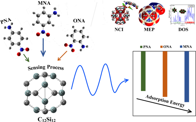 By dint of their excessive toxicity and non-biodegradable characteristics, detection of the nitroanilines that have detrimental impacts on human health and the aquatic environment is a crucial issue. For this aim, the potentiality of the silicon carbide (C12Si12) nanocage toward sensing nitroaniline compounds, including ortho-, meta- and para-nitroaniline (ONA, MNA and PNA, respectively), was accomplished through DFT computations. The electrostatic potential findings corroborated the remarkable ability of the C12Si12 nanocage to sense the ONA, MNA, and PNA molecules via the two substantial nucleophilic sites (i.e., N and O atoms) of the aforementioned molecules in the most favorable configurations. In the light of the energetic affirmations, negative interaction energies were recorded for the investigated complexes with values up to − 37.13 kcal/mol. According to the symmetry-adapted perturbation theory findings, the electrostatic force was remarked as the prevailing contribution within the adsorption process. A closer look at the outcomes of the noncovalent interaction index and the quantum theory of atoms in molecules pointed out the partially covalent nature of the interactions within the studied complexes. The apparent alterations in the molecular orbital distributions and global reactivity descriptors of the studied C12Si12 nanocage after the adsorption of the ONA, MNA, and PNA molecules proclaimed the occurrence of the scouted adsorption process. The obtained thermodynamic parameters declared the spontaneous exothermic characteristics of the interactions within the inspected complexes. The obtained findings divulged that the C12Si12 nanocage could be regarded as a promising candidate for sensing the ONA, MNA, and PNA toxic molecules, which in turn will have a pivotal role in preserving the environment.