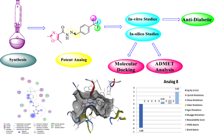 Abstract: Oxazole derived amide-based azomethines derivatives were synthesized through an efficient and facile route in this research work. By comparing with reference drug acarbose having IC50 = 7.50 ± 0.20 µM for α-amylase and 8.10 ± 0.40 µM for α-glucosidase, it was revealed that all the novel synthesized analogues exhibit varying degree of inhibition against both enzymes. The remarkably good (top ranked) anti-diabetic competitor against both enzymes was found with IC50 = 5.30 ± 0.20 µM 5.80 ± 0.10 µM) against α-amylase α-glucosidase, respectively. Other potent analogs of the series having IC50 (6.90 ± 0.40, 7.20 ± 0.10 µM), (7.60 ± 0.20, 8.10 ± 0.20 µM) and (7.80 ± 0.20, 9.10 ± 0.10 µM) also displayed excellent biological potential by engaging the active site of targeted enzymes through different interactions. The impact of substitutions on the drug profile of newly designed candidates was determined through the structure activity relationship. In silico molecular docking analysis was also conducted to predict that how the target proteins (enzyme) interact with the ligands by visualizing the 2D and 3D mode of binding interactions. The drug effectiveness of these analogues was assessed through ADMET analysis. By applying spectroscopic techniques 1HNMR, 13CNMR and HREI-MS the structural skeleton of newly designed analogues was identified. This study presents novel therapeutic agents for the future treatment of diabetes mellitus. Graphical abstract