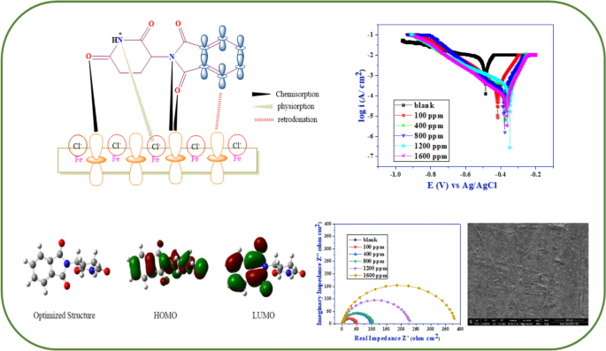 Abstract: This study investigates the corrosion inhibition performance of thalidomide on mild steel in 1.0 M HCl solution using gravimetric, electrochemical (PDP and EIS), surface characterization SEM–EDX, AFM, XPS, and quantum chemical (DFT) methods. Thalidomide exhibited maximum inhibition efficiency of 98.71 ± 0.02% at 1600 ppm, with potentiodynamic polarization indicating mixed-type inhibition dominated by anodic behavior. EIS analysis revealed a significant increase in charge transfer resistance, suggesting the formation of a stable protective layer. Thermodynamic studies confirmed spontaneous adsorption following the Langmuir isotherm, whereas surface morphology using XPS, AFM, and SEM–EDX verified the development of a corrosion-inhibiting layer. Density functional theory (DFT) calculations further validated the experimental observations, indicating a strong interaction between thalidomide molecules and the steel surface. These findings establish thalidomide as a highly effective corrosion inhibitor for mild steel in acidic environments. Graphical abstract