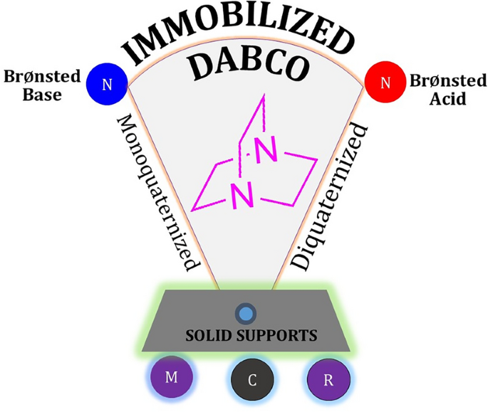 Abstract: This review outlines a strategic method for immobilizing DABCO-based ionic liquids (ILs) on various solid supports to facilitate multi-component reactions (MCRs). DABCO (1,4-diazabicyclo[2.2.2]octane) is a rigid, nitrogen-rich bicyclic amine that has been functionalized to create a series of task-specific ILs. The immobilization of these ILs combines the advantages of traditional ILs with the practical benefits of heterogeneous catalysis. Attaching DABCO-based ILs to solid supports enhances their recovery and reusability while maintaining consistent catalytic activity. Various studies have evaluated their performance across different MCRs, demonstrating high yields, short reaction times, and mild conditions. Spectroscopic and analytical techniques have confirmed the structural integrity and stability of these catalysts. These catalysts function as both base and acid catalysts, facilitating substrate activation and improving reaction kinetics. Recycling studies showed minimal activity loss over multiple cycles, emphasizing their sustainability. The heterogeneous nature of the catalysts allows their easy separation from the reaction mixture, aligning with green chemistry principles. This review presents a versatile and eco-friendly platform for developing recyclable DABCO-based heterogeneous catalysts suitable for a broad range of organic transformations. Graphical Abstract