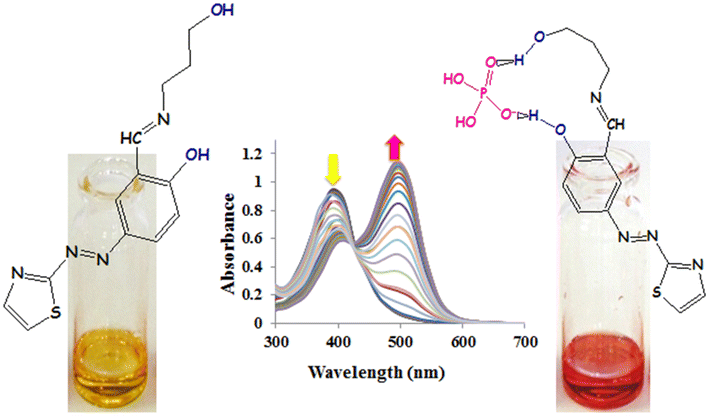 Abstract: A new colorimetric chemosensor L, containing electron-donating moieties attached to the thiazole-based Schiff base was synthesized. The optical and colorimetric sensing properties of L for anions and cations were investigated using naked eye, UV–Vis and computational studies. The receptor L displays visual changes towards anions like F−, H2PO4− and AcO− and also towards cation such as Zn2+ in DMSO. Other anions such as Cl −, Br−, I−, NO3− and HSO4− did not cause any color change. On the addition of other metal ions such as Cr3+, Mn2+, Fe3+, Co2+, Ni2+, Cu2+, Cd2+, Hg2+ and Pb2+, the receptor did not show any significant change. The binding constant (Ka) and stoichiometry of the host–guest complex formed were calculated by the Benesi–Hildebrand (B–H) plot and Job’s plot method, respectively. Computational studies and UV–Vis titration were further used to emphasize the sensing behavior of the receptor. Quantum chemical calculations and molecular studies using Density Functional Theory and Molecular Electrostatic Potential surface studies were carried out to supplement the experimental results and gain deeper insights about the structural as well as the spectral aspects of the complex. Receptor L proved to be a fluorescence and colorimetric Zn (II), fluoride (F−1), di-hydrogen phosphate (H2PO4−1) and acetate (AcO−1) sensor. This new chromogenic receptor shows a highly selective coloration for the above ions. The chemosensor showed a color change upon addition of Zn (II), or fluoride or di-hydrogen phosphate or acetate ions.