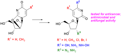 Abstract: A series of ten pyrimidine nucleosides modified in 2′ position with azide or amine group was tested for the antibacterial, antifungal and cytotoxic activity. The cytotoxic effect was determined on three cancer (CCRF-CEM, MCF7, HeLa) and one normal (HEK293) cell lines, while antibacterial activity was evaluated on five bacterial strains. Among others, 2′-azido-2′deoxycytidine and 2′-amino-2′-deoxycytidine exhibited the strongest antiproliferative activity at 200 μM concentration, decreasing the viability of CCRF-CEM cells to 33 ± 1 and 36 ± 2%, respectively. Newly synthesized 2′-amino-2′-deoxythymidine exhibited cytotoxic effect exclusively toward HeLa cancer cell line, but not toward the normal HEK293 cells. Also, investigated compounds did not exhibit any antibacterial or antifungal activity at a concentration of 40 mM. The obtained results suggest that the presence of cytosine base is desirable for the appearance of cytotoxic effect, while the structural variations of the sugar ring play a minor role. Future modification of 2′-amino-2′-deoxythymidine could be a promising way to obtain more active anticancer substances.