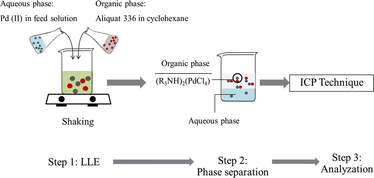 Abstract: In this study, liquid–liquid extraction with Aliquat 336 in the presence of cyclohexane as a mobile carrier was investigated to purify Pd(II) from industrial wastewater. Kinetic and thermodynamics analysis showed that Pd(II) extraction was of first-order reaction: the reaction was endothermic reaction which was governed by the diffusion region. The influence of temperature on isotherm model was also investigated. With an increase in reaction temperature, all three isotherms Langmuir, Freundlich and Temkin isotherm become inaccurate. Results show that the Langmuir isotherm model was preferred for the study of the Pd(II) ion experimental isotherm. Response surface methodology was employed to study the five independent variables which have an effect on the percentage of extraction of palladium(II) ions as a dependent variable. Optimum extraction conditions for the five independent variables were as follows: Aliquat 336 concentration (0.6 M), pH of feed solution (2.0), stirring speed (600 rpm), reaction time (10 min.) and reaction temperature (318 K).