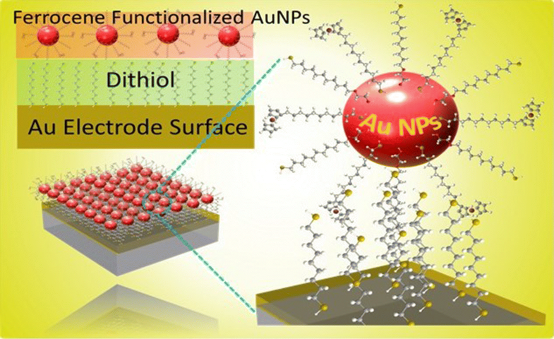 Keywords: Thiolated ferrocene ; Functionalized gold nanoparticles ; Thiolated polyethylene glycol ; Cyclic voltammtery ; Dithiol monolayer ; Redox activity