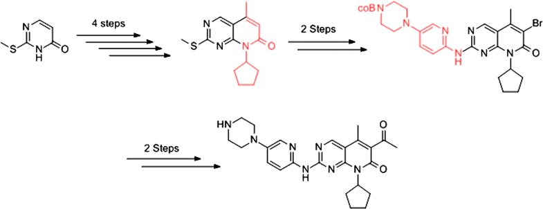 Abstract: In this paper, a novel synthetic method for Palbociclib was reported. It was synthesized in eight steps from 2-(methylthio) pyrimidin-4-(3H)-one with approximately 10% overall yield. This protocol started material 2-(methylthio) pyrimidin-4-(3H)-one, involved nucleophilic substitution by thionyl chloride, bromination, nucleophilic substitution by cyclopentylamine, a one pot-two step method (Heck reaction, ring close sequence), oxidation and bromination, cross-coupling reaction, Heck reaction, aqueous workup to afford Palbociclib. This synthetic route used inexpensive raw material and reagents, involved readily controllable reaction conditions and reduced environmental hazards. Synthesis of Palbociclib, a small molecule CDK inhibitor, starting from 2-(methylthio) pyrimidin-4-(3H)-one by 8 steps reaction. This method afforded the Palbociclib in 10% yield.