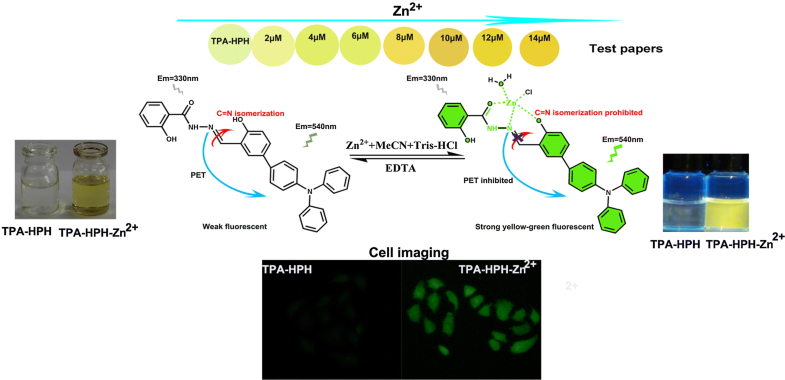 Abstract: A novel Zn2+ fluorescent probe Nʹ-((4′-(diphenylamino)-4-hydroxy-[1,1′-biphenyl]-3-yl)methylene)-2-hydroxybenzohydrazide (TPA-HPH) with a larger Stokes shift (210 nm) was designed and synthesized, which was seen to be highly selective and sensitive to Zn2+ ion over other metal ions in the system of MeCN:H2O (V/V = 6:4, pH = 7.0). Meanwhile, it was observed that the TPA-HPH solution changed from colorless to yellow by “naked eye” when Zn2+ was added. Under optimized conditions, the fluorescence intensity of the probe showed a good linear relationship with Zn2+ ion concentration in the range of 0–10 μM with a low detection limit of 7.3 × 10−10 M. The fluorescent mechanism was proposed. Most importantly, TPA-HPH could realize on-site monitor and live cell imaging for Zn2+ ion.