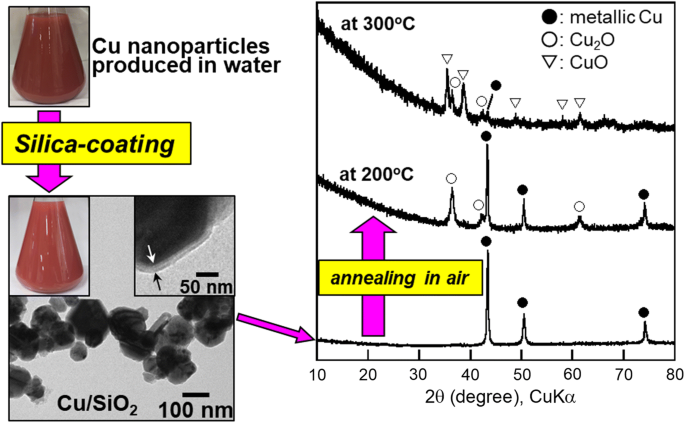 A safe, simple, and low environmental impact method for controlling the oxidation and aggregation of metallic copper (Cu) nanoparticles has yet to be developed. This paper describes the synthesis of metallic Cu nanoparticles dispersed in water fabricated by a surfactant-free method and silica coating of metallic Cu nanoparticles. A colloid solution of metallic Cu nanoparticles was prepared from Cu(CH3COO)2 (Cu source), hydrazine (reducing reagent), and citric acid (stabilizer) in water in air. Silica coating of the metallic Cu nanoparticles was performed by adding sodium silicate to the metallic Cu nanoparticles in water. The silica-coated nanoparticles had a particle size of 99.2 ± 34.8 nm, a silica shell thickness of 5.8 nm, and a crystal size of metallic Cu of 28.5 nm. The metallic Cu nanoparticles in the silica-coated particles were not so oxidized even with annealing in air at 200 °C: the silica shells functioned as a physical barrier to control oxidation of the metallic Cu nanoparticles.