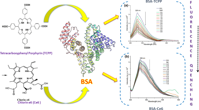 In order to use tetrapyrrolic macrocyclic species in medical applications, the interactions of bovine serum albumin (BSA) with tetrakis-para-carboxyphenyl-porphyrin (H2T(p-COOH) PP or TCPP) and Chlorin e6 (Ce6), under different conditions, were investigated by fluorescence spectroscopy and UV–VIS absorption spectroscopy and contrasted with molecular docking study. The binding constant (Kb) values at three different temperatures were calculated using the modified Stern–Volmer equation. The enthalpy change (ΔH) and entropy change (ΔS) were determined based on the van’t Hoff equation. The results of fluorescence spectroscopy indicate that static quenching is the dominant process resulting from the BSA-TCPP complex formation. In the case of the BSA-Ce6 complex, static quenching was confirmed too. Thermodynamic analysis indicated that hydrogen bonds and van der Waals interactions were the predominant intermolecular forces in the binding process to stabilize the BSA-TCPP and BSA-Ce6 complexes. Molecular docking suggests that the probable binding site of the two macrocyclic species at BSA occurs in the vicinity of the Trp-134 residue. Molecular modeling study further confirmed interactions in the binding mode obtained experimentally.