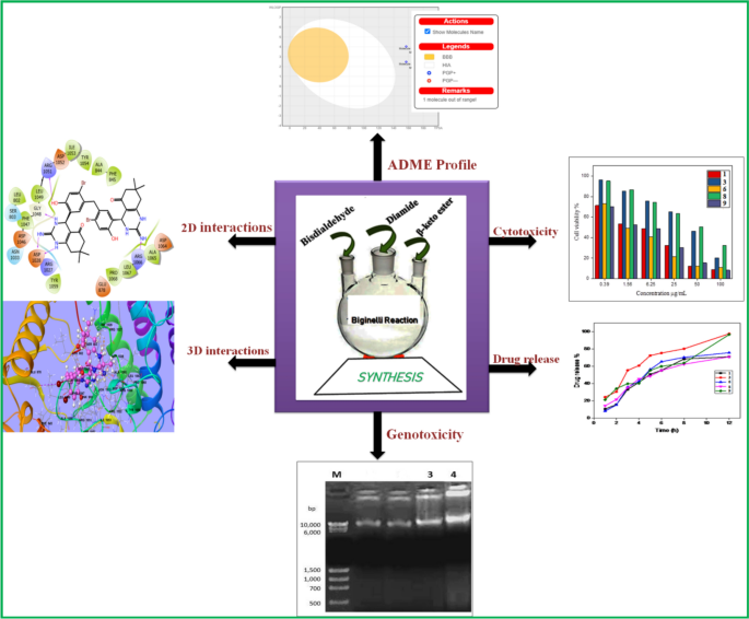 Abstract: Dihydropyrimidin-2(1H)-ones (DHPMs) have garnered significant attention in synthetic and medicinal organic chemistry because of their remarkable biological and therapeutic potential. In this study, DHPM derivatives were synthesized using the Biginelli reaction starting from bisdialdehyde to identify potential lead compounds. The predicted lipophilicity values of the synthesized DHPMs were in the range 2.77- 4.3. Log Po/w indicates the drug-likeness properties of the synthesized compounds. Structural confirmation was achieved through advanced spectroscopic techniques. DHPMs 7 and 9 demonstrated strong antimicrobial activity, effectively targeting a wide range of microbes. Molecular modeling further revealed that DHPM 9 exhibited a notable docking score of -8.161 kcal/mol, indicating a high binding affinity for VEGFR-2 kinase. According to HOMO and LUMO studies, DHPM 1 is the most stable of the DHPMs (ΔE = 4.838 eV), while DHPM 9 is the most reactive with the smallest energy gap (ΔE = 3.677 eV). The anticancer potentials of synthesized were evaluated using A549 lung cancer cell. The work highlights significant cytotoxic effects on A549 cells with IC50 values of 1.56 μg/mL. The genotoxicity assay is performed using agarose gel electrophoresis, which is an appropriate method for assessing mutagenic potential. The results indicate that compound 7 exhibits moderate genotoxic potential at 125 μg /ml. DHPM 9 exhibits strong activity against Enterococcus faecalis, with an MIC range of 6.30 μg/mL, and is chemically more reactive than the other compounds, which is consistent with the strongest anticancer and antimicrobial activity values. DHPMs 7 and 9 stood out with the highest cumulative release percentages at the final time point (68.54–74.85%), showcasing their efficient delivery capabilities. The research aims to contribute to public health by evaluating the biological effects and therapeutic potentials of the synthesized compounds. Graphical abstract