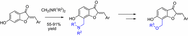 Abstract: An efficient method for regioselective synthesis of C-7 Mannich bases of 6-hydroxyaurones was accomplished by the N,N-dialkylaminomethylation using aminals prepared from dimethylamine, dipropylamine, bis(2-methoxyethyl)amine, N-methylbutylamine, N-methylbenzylamine, morpholine, piperidine, and 1-methylpiperazine. Further transformation of 7-(N,N-dialkylamino)methyl group in these aurones led to formation of C-7 acetoxymethyl and methoxymethyl derivatives of 6-hydroxyaurones, some of which showed promising inhibition of PC-3 prostate cancer cell proliferation in the high nanomolar to low micromolar range that exceeded that of cisplatin. Compound 12c (R3 = Ac, Ar = 3,4-OMePh) displays 75% inhibition of PC-3 prostate cancer cells proliferation at 300 nM concentration.