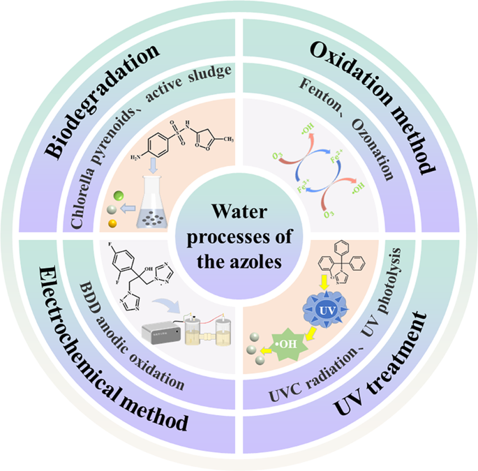 Ensuring clean water quality is crucial for human health and environmental sustainability. The persistence of azole compounds—a class of antifungal agents (e.g., fluconazole, ketoconazole, miconazole)—in aquatic systems presents significant challenges to water quality management due to their endocrine-disrupting effects, contribution to antibiotic resistance, and resistance to conventional degradation. This review systematically examines recent advances in azole removal technologies, including UV photolysis, UV-Fenton, anode oxidation, photocatalysis (using metal oxides like TiO2 and ZnO), ozonation, electrochemical oxidation, and adsorption. Key findings show that vacuum UV (VUV) and UVC-enhanced photolysis achieve complete (100%) degradation of certain azoles, while the UV-Fenton process degrades over 80% of miconazole under optimized conditions. Boron-doped diamond (BDD) anode oxidation demonstrates exceptional efficacy, eliminating 100% of Imazalil, tebuconazole, and penconazole within 60 min. Photocatalytic degradation using TiO2 achieves > 80% ketoconazole removal, attributed to enhanced charge separation and production of reactive oxygen species. Ozonation was proven to be a highly effective process is effective for some recalcitrant azoles, such as 99.1% removal of climbazole, while biodegradation shows species-dependent variability, with fluconazole exhibiting negligible removal. Adsorption and electrochemical oxidation also show high efficiency (70–95%) but need optimization for cost-effectiveness. Despite these advances, the combined use of processes, like hybrid photolysis-adsorption systems, remains unexplored. Further research should focus on understanding the degradation mechanisms, pathways, scalability over the life cycle, and developing standardized evaluation protocols across different water matrices. This works a roadmap for advancing azole remediation technologies to support sustainable water resource management.